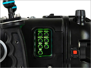 グリップ周りに配置された大型ダイヤルやレバーの操作に加え、バックライト付きの一連の電子制御にも対応します。ウジングの左側にある Iris+/-、Shut+/-、ISO+/-、WB、およびハウジングの上部にある Pre-Record、FPS+/-、Playback、Play/Pause、Magnify、および Tools にアクセスできます。