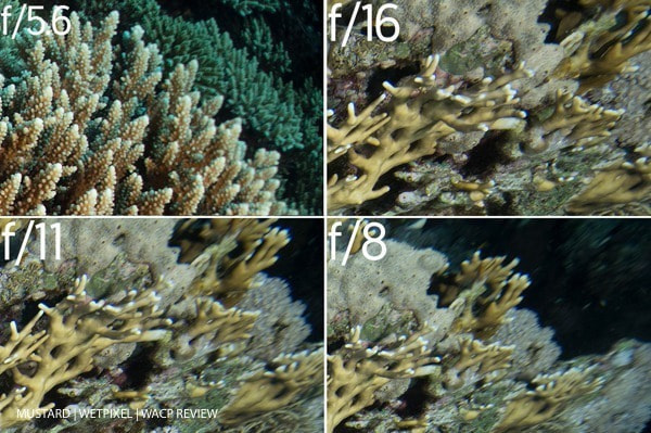 ワイドアングルコンバージョンポート(WACP)と通常のドームポートの水中画像周辺部の画質の比較(Nauticam光学研究所)