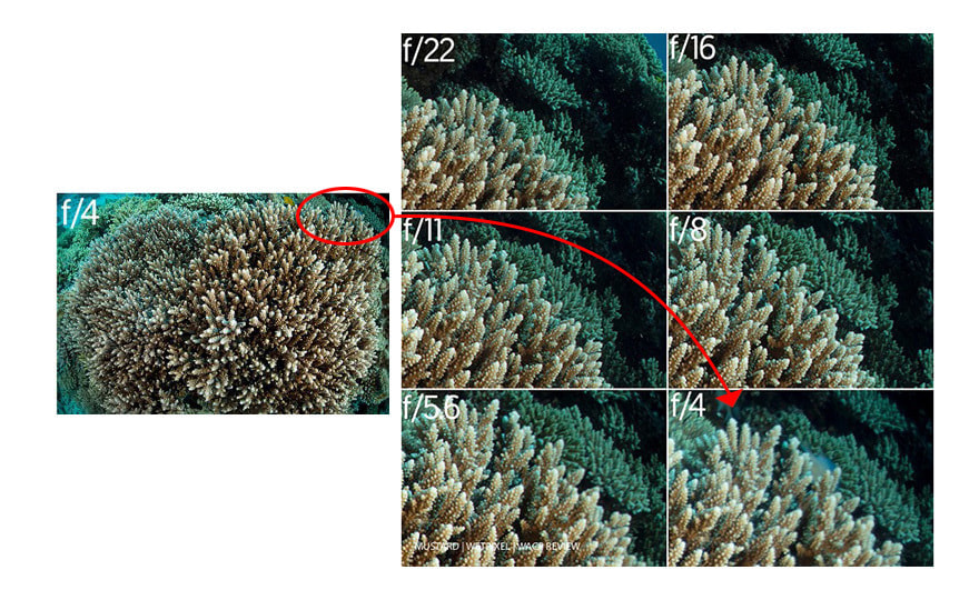 水中では、ドームポートが追加のレンズ構成として機能し、カメラに非常に近い被写体の虚像を作成します。問題は、虚像が湾曲していることで、虚像の被写体の周辺部分は中心部よりもカメラに近く見えます。そのため、周辺部は被写界深度から外れたり、湾曲が強いため周辺部が甘く見える原因になります。また、レンズが広角であるほど問題が顕著になります。
