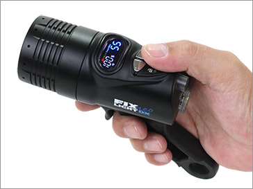 ハウジングのグリップにコントローラー(別売)を取り付ければ、オン/オフ、光量調節が手元で操作ができ、撮影時の操作ストレスが大幅に軽減します。