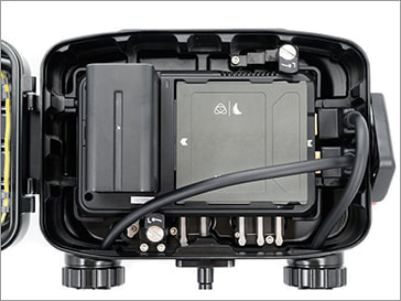 AtomX SSDmini 1TBを併用した場合、最長で150分の4K/60P 4:2:2 10bit動画を収録できます。モニター本体もNP-F970バッテリーで最長約2時間の稼働が可能。いずれもジャストサイズでハウジングに収納されます。