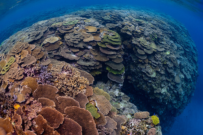 「MWL-1の画角はフィッシュアイレンズの画角に比べると、若干狭くなっています。このことは、2つの意味で使いやすいと言えます。 ひとつ目は、被写体と少し距離を取れるということ。距離をとっても被写体が小さくなりすぎないので、ライティングがしやすくなります。下のリュウキュウキッカサンゴの作例も ストロボで撮影していますが、被写体から少しだけ離れることで、サンゴの群生全体に光を回すことができました。フィッシュアイレンズで被写体に触れるくらい寄ってしまうと、このように光を全体に回すことが難しくなります。
