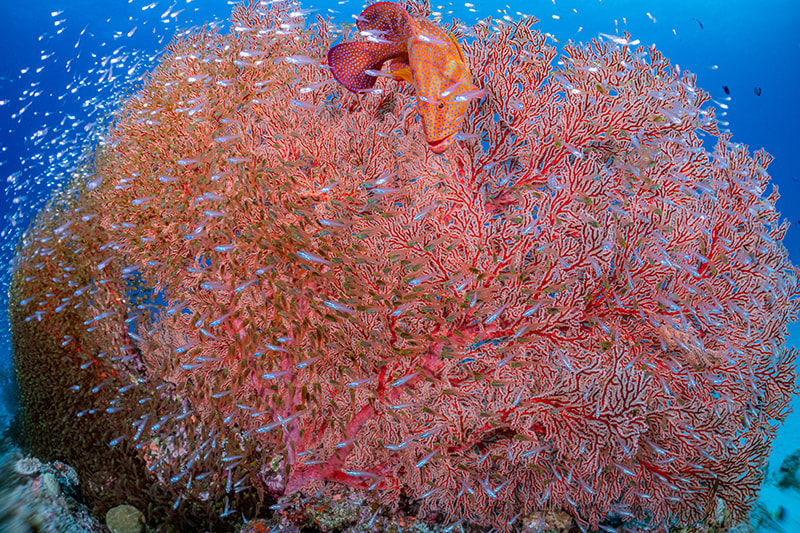 イソバナにスカシテンジクダイとキンメモドキが群れていました。捕食者であるユカタハタが小魚に突っ込む瞬間を狙ってシャッターを切りました。 MWL-1はフィッシュアイレンズに近い画角・描写のため、被写体にグッと寄ることで、パースを強調した臨場感のある画作りができました。 MWL-1を装着しても、60mmマクロの「爆速」と言われているAFスピードはほぼ変わらず、瞬時にピントを合わせられたので一瞬のシャッターチャンスを逃さず撮影できました。