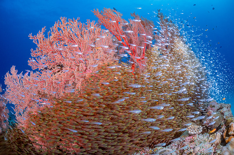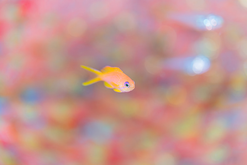 イソバナに小魚が群れるシチュエーションは、ワイドでもマクロでも魅力的な被写体。ワイド撮影では、圧倒的な魚の多さと、群れの統一された動きの美しさを切り取ろうと撮影しました。ファインダーを覗いている感覚が普段使っているフィッシュアイレンズと変わらなかったので、ストレスなく撮影できました。 マクロ撮影では、小魚の玉ボケとイソバナの鮮やかな赤を背景に入れて画作りをしています。 こういった環境ではついついワイド撮影用のレンズを選択してしまいますが、水中でレンズの着脱が可能なため、贅沢な環境でマクロ撮影ができました。 現場は潮の流れが速く身体を安定させるのにもひと苦労でしたが、バヨネットシステムでレンズ着脱が簡単だったことで助かりました。