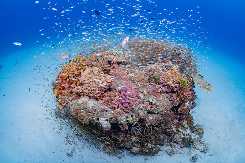 ふたつ目は、余計な部分を画面に入れずに済むということ。 このリュウキュウキッカサンゴは、群生とは言え、周りは岩肌が露出している部分も多く、フィッシュアイレンズで撮影したら、少し寂しい光景になっていたはずですが、MWL-1の画角だと、ちょうどサンゴの密度が高い部分だけを切り取ることができました。こういったケースは意外と多いし、余計な部分を写さなくて済むことで、画作りが容易になるように感じました」