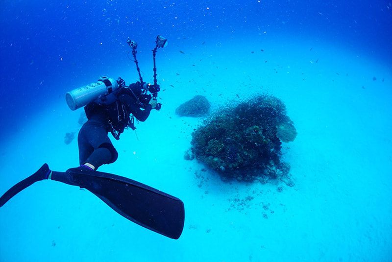 俯瞰で、砂地にポツンと位置するサンゴの根を狙う上出さん。狙いはワイド、MWL-1が威力を発揮します