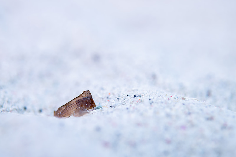 慶良間らしい光景をワイドで切り取ろうと、海・砂地・根のバランスを考えて撮影しました。 根の周りをグルグル泳ぎ回り、彩りが豊かに見えそうな場所から、魚の動きがまとまるのを待ってシャッターを切っています。 MWL-1は思っていた以上に小型軽量で、機動性に優れているため、持ちながらの移動も苦になりませんでした。 納得できる写真が早めに撮れたので、後半はマクロ撮影に時間を費やすことに。〈ダイブイン浜〉のガイド宮平洋一さんが、根のすぐ近くの砂地でツマジロオコゼの幼魚を見つけてくれたので、逃げる被写体に苦戦しながらもじっくり撮影しました。