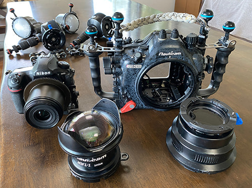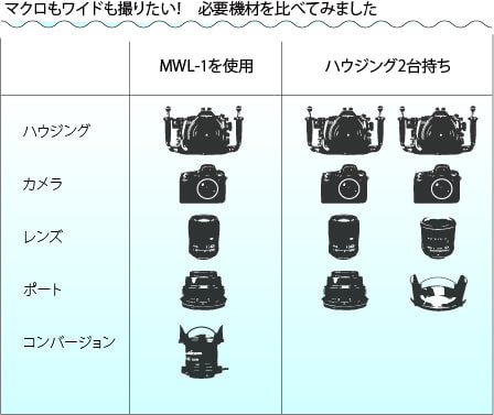 カメラ1台、マクロレンズ1本、ハウジング1台、ポート1つ、ライティングシステム1セット。これにMWL-1で、機材準備は完了です