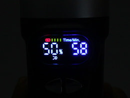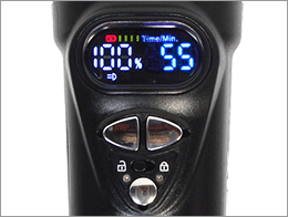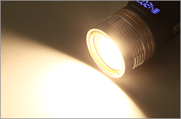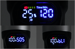 電源ボタンを押すだけで4段階(25%,50%,75%,100%)の光量調節が可能。左右の調光ボタンによる100ステップ(0〜100%)の微調節もできます。いずれも指1本で簡単操作。誤操作防止用のロックも装備しています。