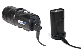 取り外したバッテリーへの充電はもちろん、付属の専用プラグをボディ背面のマグネット端子に接続することでダイレクトチャージが可能。ダイビングのインターバルで、バッテリーをボディから取り出す手間なく簡単に充電ができます。