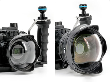 N50ポート交換システムを採用。標準装備の『Cスタンダードポート100』はZEISSバリオゾナーT*9.0-72mm(35mm判換算24-200mm)の高倍率ズームレンズに全域で対応可能。オプションの『C90ドームポート』はワイド撮影専用のポート。『NA CワイドポートBM17/25』は、使用ズーム域に制限がありますが、『NA バヨネットアダプターリング MC』を取り付けたマクロコンバージョンレンズやワイドコンバージョンレンズの使用が可能となります。