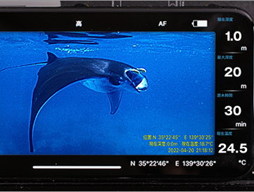 スマートフォンからの緯度・経度、日時の表示に加え、標準装備の水圧/温度センサーにより、深度(現在・最大)、潜水時間、水温を表示することができます。また、撮影時に画像内へ(深度、潜水時間、水温、緯度・経度、日時)を記録させることもできます。