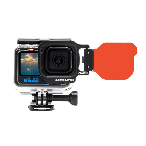 GoProシリーズ対応の水中専用補正フィルター「FLIP+DIVEフィルター」を標準装備。レンズ前面に取り付けることで青カブリを抑え、適切な色再現での撮影を可能にします。フリップ式のフィルターは、指1本の操作で簡単に着脱することができます。