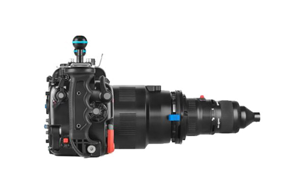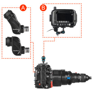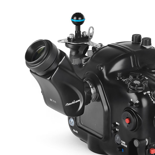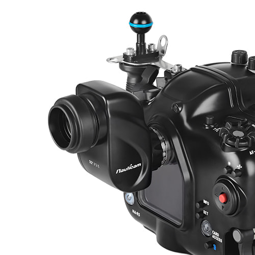 カメラのファインダー像の逆像を正像に補正し等倍~0.8倍に拡大します。視度補正ダイヤルが装備されており、水中でも視度補正が可能「+3~-3」。