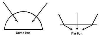 水中でワイドレンズを使用する場合は、ドーム内の空域に光が通過するときに光を屈折させないため、フラットポートに比べ空気中と同じ画角が保持でき、収差も少なくなります。