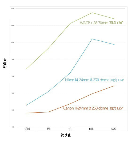 WACP-1の方が画角が広いのにもかかわらず、WACP-1の「f/5.6」の画質は、16-35mmの「f/16」の画質に匹敵します。
