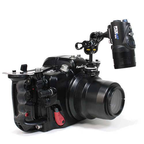 A short arm attached to cold shoe of housing or lens port. By an original locking mechanism, you can put/take off easily and fix it certainly.