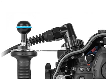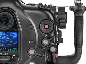 水中での操作性を向上させるため、操作ボタン/レバーを左右グリップに集約させました。グリップから手を離すことなく、メイン電子ダイヤル、サブ電子ダイヤル、マルチファンクション、ダブルサムレバーなどの操作部に素早くアクセスできます。