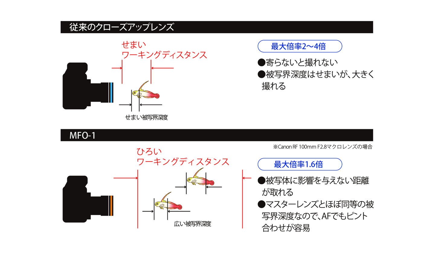 様々な距離や動き回る被写体に対して、高倍率クローズアップレンズと異なり、マスターレンズに近い被写界深度と広いワーキングディスタンスでカバーし柔軟に撮影することができます。