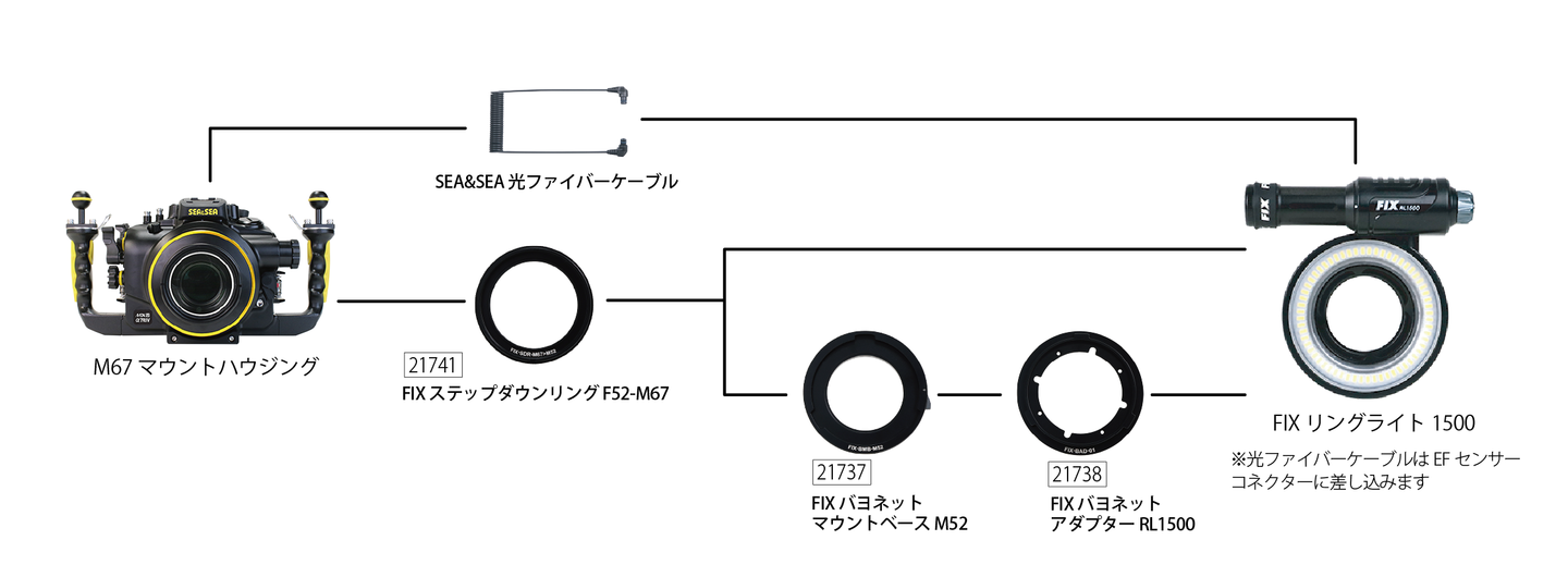 光ファイバーケーブルでリングライト1500とハウジングを接続すれば、M67マウントのミラーレス一眼でもEFモードを使った撮影が可能です。