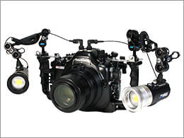 強化アクリル製のドームレンズにより、120度の広い水中照射角を実現。ドームは取り外し可能、 フィルター類の装着にも対応します。