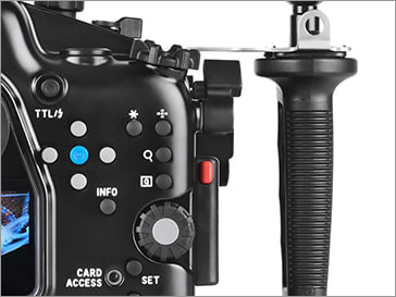 水中での操作性を向上させるため、操作ボタン/レバーを右手側に集約させました。グリップから手を離すことなく、メイン電子ダイヤル、サブ電子ダイヤル、コントロールダイヤル、デュアルサムレバー、サブレバーで、AF-ON、M-Fn、動画撮影やISO感度設定などに素早くアクセスできます。