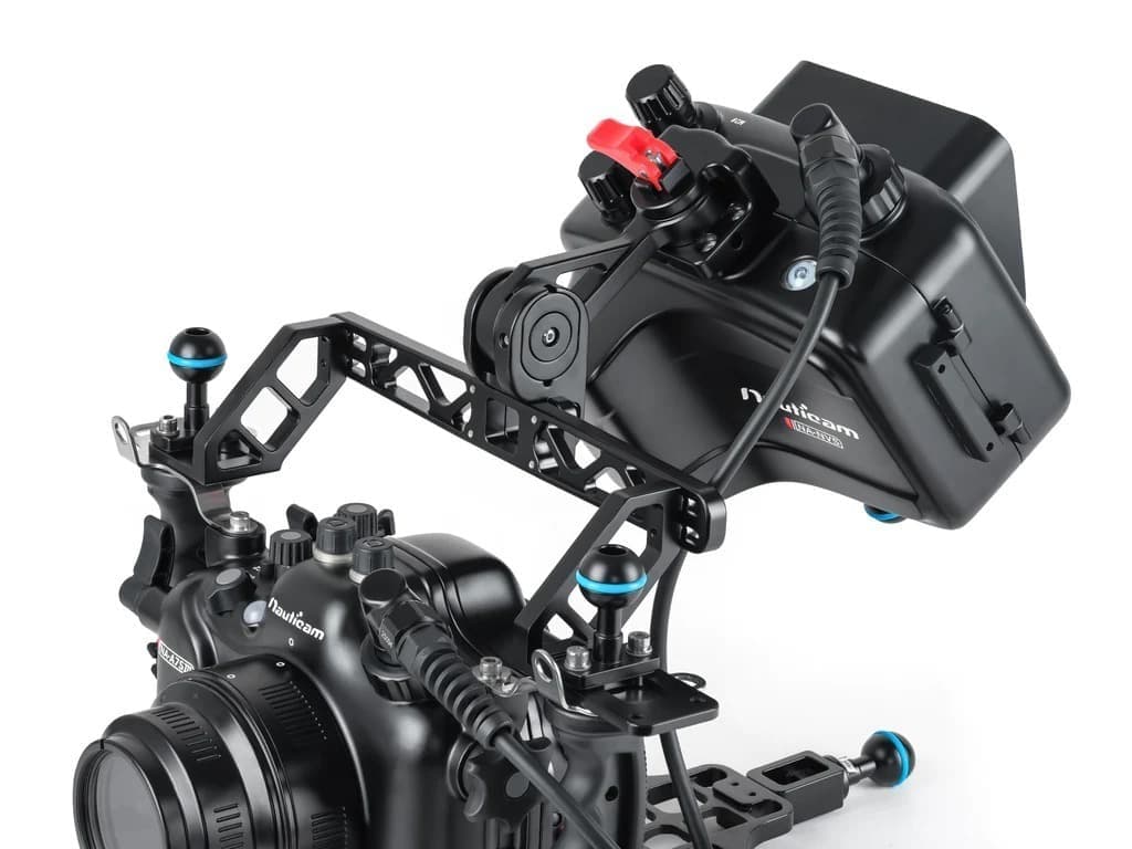 カメラハウジングに「NA マウンティングシステム」を取り付けることで、ライティングシステムなどに干渉することなくモニターハウジングを取り付けることができます。また、モニターハウジングをカメラハウジングの背面に固定し、モニターの角度を調整することで安定したポジショニングで撮影を行うことができます。