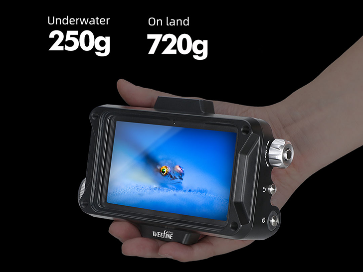 コンパクトなボディは、陸上(720g)水中(250g)と軽量ながら、耐圧水深100mを実現しています。