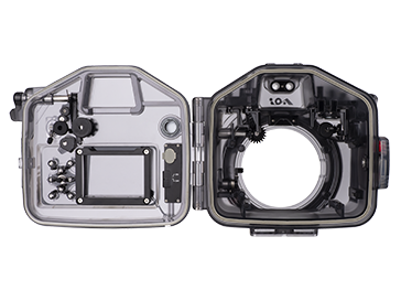 OM SYSTEM OM-5 Mark II対応のハウジングです。本体はスケルトン・ブラックの樹脂製で内部が透けて見えるユニークなデザインになっています。