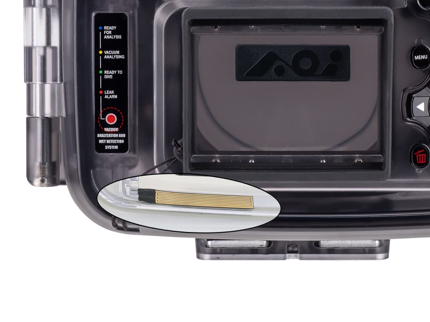 ハウジング内の圧力をモニターすることによりハウジングの密閉性を確認するセンサー標準装備。付属のポンプを使用してハウジング内部を陰圧状態にすることにより密閉性をリアケースのインジケーターの色で表示します。