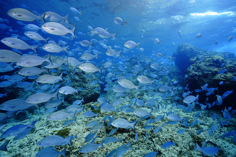 小笠原で撮影したミナミイスズミの群れです。絞りやシャッタースピードを変えるダイヤル、メニューなどのボタンが非常に使いやすい場所に配置されているNauticamのハウジングでは、手元の操作にストレスを感じることはほとんどなく、魚の瞬間的な動きにも簡単に応えてくれる喜びがあります。