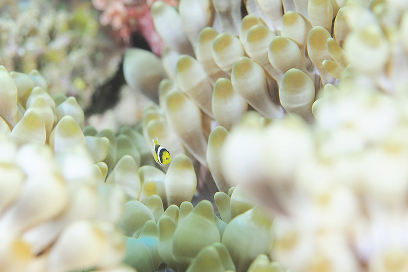 イソギンチャクを住みかとする可愛い子供のクマノミがいたので奥行き感を出すためにわざと前ボケを入れ込み撮影しました。この撮影で使用したOLYMPUSのカメラはもともと小型で軽量が特徴ですが、それに合わせて作られたNauticamのハウジングも追随するように軽くなっています。さらにはカーボンフロートアームの浮力によって水中でほとんど重さを感じることはありません。マクロで粘っても手首が疲れるようなこともなく安定して使うことができます。