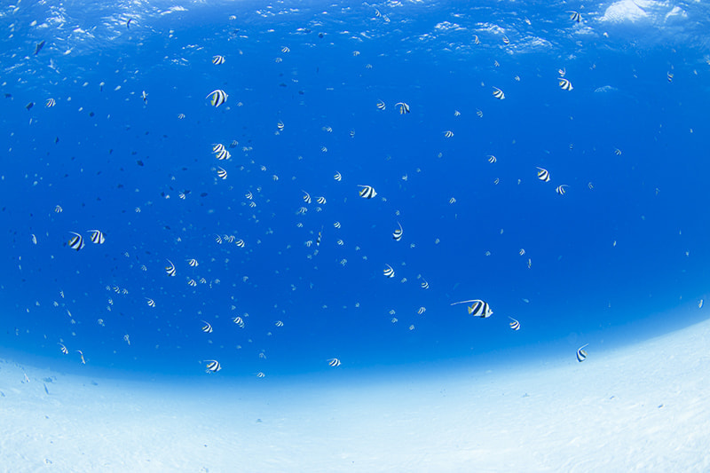 モルディブの「Maagiri Rock」は真っ白なパウダーサンドが一面に広がっていて、潮のタイミングが合うとこのようにムレハタタテダイが砂地まで降りてきて天国のような光景ができ上がります。