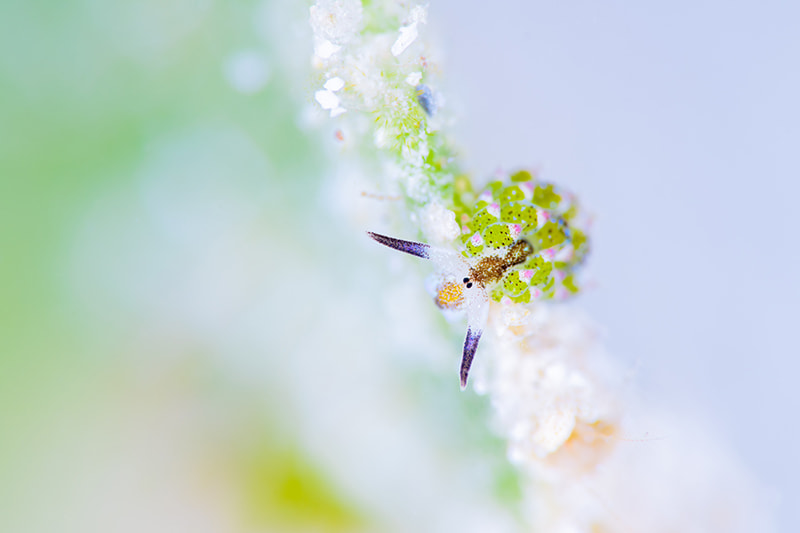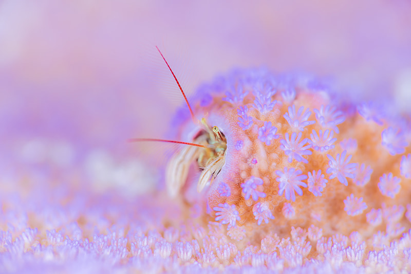 NA スーパーマクロコンバージョンレンズ SMC-1は、ピント面の解像度が高いため、ボケを生かした柔らかい画作りをしても、ピントを合わせた1点で作品を締めることができます。マニュアルフォーカスでカンザシヤドカリの目にピントを合わせましたが、フォーカスノブの操作感がカメラを直に触っているよりも心地よくて助かりました。