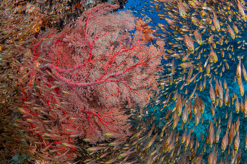 沖縄本島最北端、辺戸岬をドリフトで流していました。ダイビングの後半、水深30m前後でこの光景に出会いました。撮影に費やせる時間は限られていましたが、撮影画像を再生しながら急いでカメラの設定を調整しました。深場でも操作性が安定しているNauticamだから撮影できた1枚です。ISO感度を変更するレバーが使いやすい所に配置されていて、とっさにISO感度を変えられたことも大きかったですね。