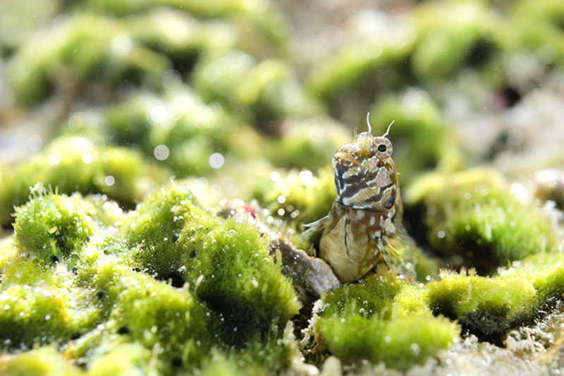 水深1mに棲むヒレナガカエルウオ。背景はちょうどいい具合の海藻。さらに天気がよかったので、強い逆光を利用することにしました。顔が暗くならない範囲で海藻の緑を明るめに仕上げるために、ストロボを少し弱めに発光するように補正。NA D850の補正の容易さが助けになりました。あとはいい表情をしてくれるのを待つだけでした。