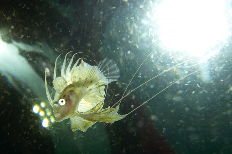 キアンコウの幼魚は大人気で、あっという間に周りに人が集まります。こうなるとワイド撮影は困難。マクロでも人物が写り込んでしまうので、開き直って他人を利用することにしました。友人のライトをバックライティングに利用。左手には別のダイバーのドームポートが迫っていたので、その反射も利用。背後からの光を中心に魚の半透明な感じを表現するため、自分のストロボはかなり弱く発光させています。