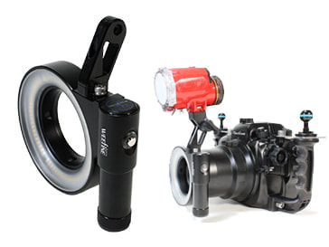 発光リングの内側に傾斜を付けているため、ポートやレンズの直前まで接近した被写体にもしっかりと光がまわります。