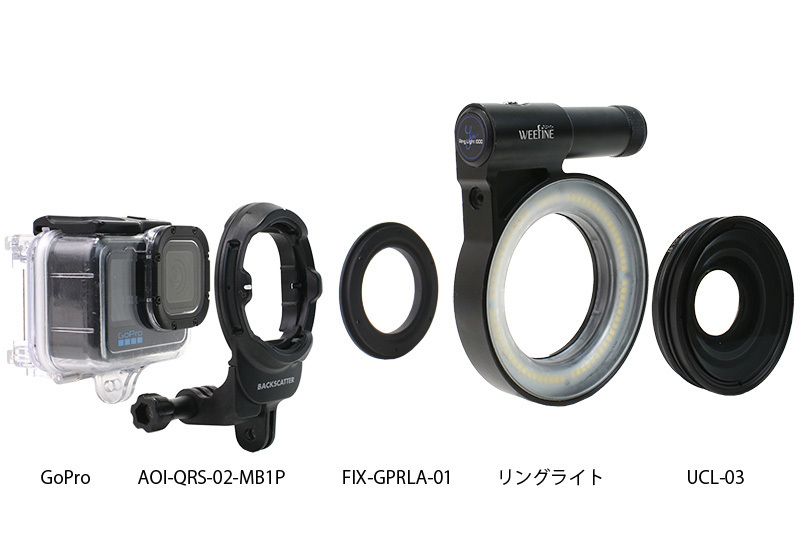 FIX-GPRLA-01をAOIのUCL-03につけてリングライトにセット。QRS-02-MB1Pを介してGoPro純正ハウジングに取り付けて使用します。