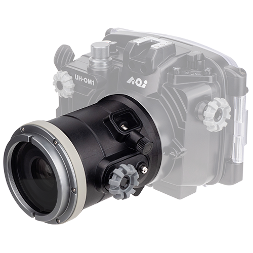 コンパクト設計のED 90mm Macro PRO Lens用ポート。超高倍率撮影を可能とした高性能望遠マクロレンズの性能を水中でフルスペック発揮することができます。