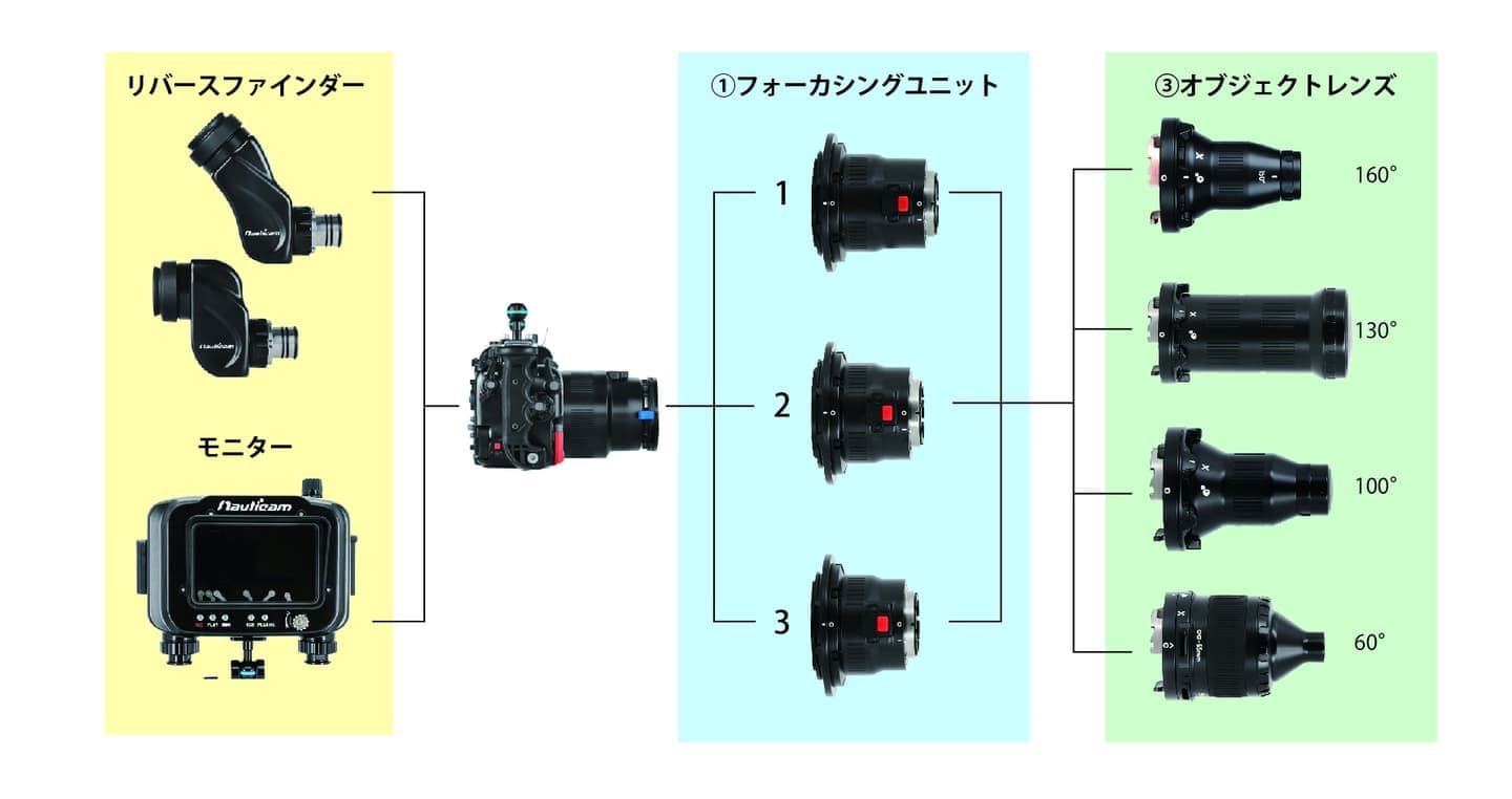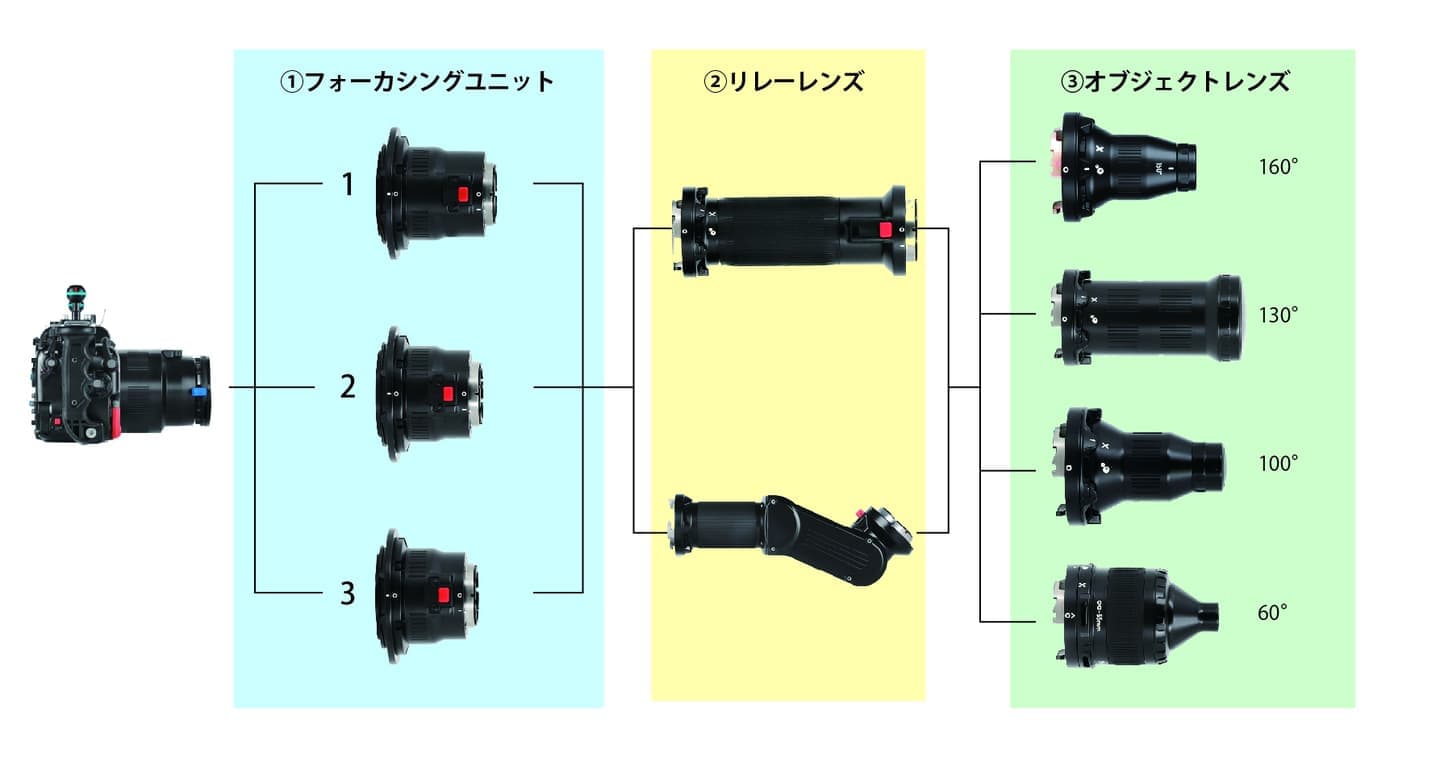 レンズ本体は『フォーカシングユニット』『リレーレンズ』『オブジェクトレンズ』と3分割ができます。また各ユニットは防水コンパートメントになっており、水中での組み立て・分解が可能。