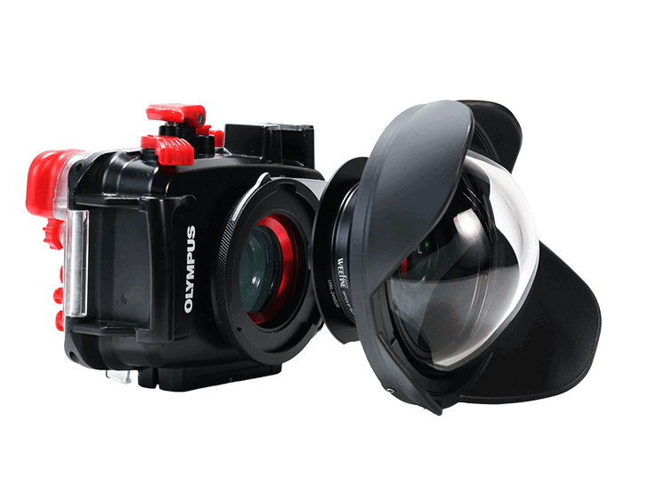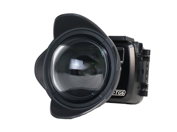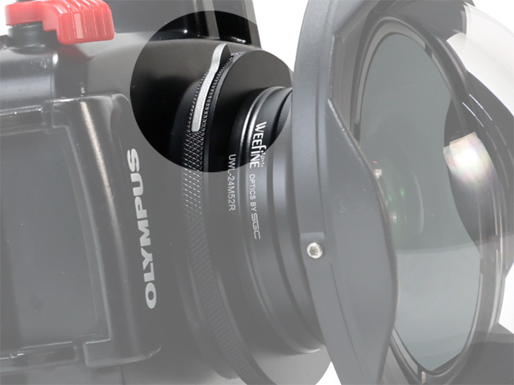●水中撮影専用に設計されたワイドコンバージョンレンズです。焦点距離24mm(35mm判換算)のレンズで使用した場合、倍率0.47、約150°の超広角撮影が可能です。