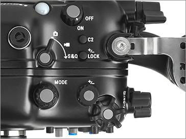 コントロールは直感的に配置され、操作ボタン/レバーを右手側に集約させました。また、ハウジングの上部にある新しい専用レバーにより、静止画、動画、S&Q(VFRビデオ)モードをすばやく切り替えることができます。右ハンドルの近くにあるデュアルサムレバーはRECボタンとAF-ONボタンを操作できるなど、重要なカメラコントロールにすばやくアクセスでき、水中での撮影に集中することができます。