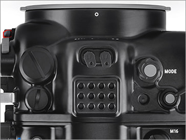 水中での操作性を向上させるため、操作ボタン/レバーを右手側に集約させました。グリップから手を離すことなく、メイン電子ダイヤル、サブ電子ダイヤル、コントロールダイヤル、デュアルサムレバー、サブレバーで、AF-ON、M-Fn、動画撮影やISO感度設定などに素早くアクセスできます。