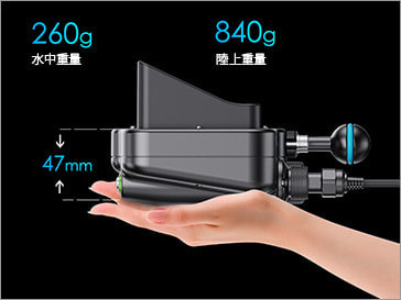 サイズは156X106X47 mmの薄型ボディ。水中重量はわずか260g(陸上 840g)。カメラハウジングに取り付けても大きな負担になりません。