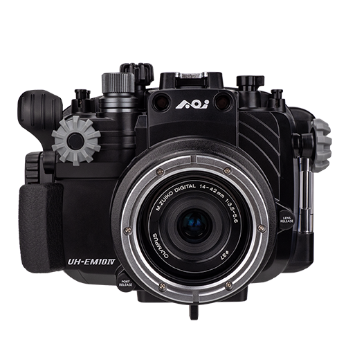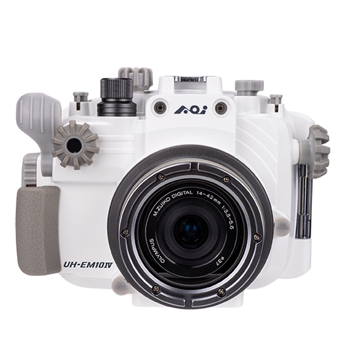 対応カメラ・オリンパス E-M10 Mark IVは、OM-Dシリーズのエントリーモデル機です。カメラ自体がPENシリーズ(E-PL系)からOM-Dシリーズにランクアップし、EVF(液晶ビューファインダー)を装備しています。ペンタ部分のぶんだけハウジングも縦方向にやや大きくなりましたが、「軽量コンパクト」というコンセプトは変わりません。