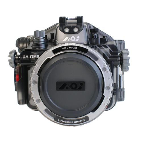 OM SYSTEM OM-5対応のハウジングです。本体はスケルトン・ブラックの樹脂製。内部が透けて見えるユニークなデザインになっています。